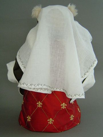 Das Überkleid (Surcot) ist aus bestickter Seide. Der ebenfalls bestickte Schleier (Gebende) ist aus feinem Leinen.